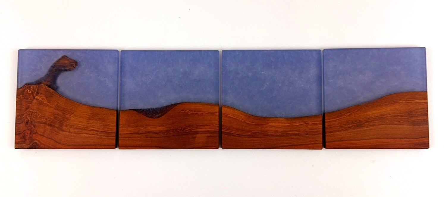 Set of four Applewood coasters with Blueslate epoxy resin. All coasters are identical in size.