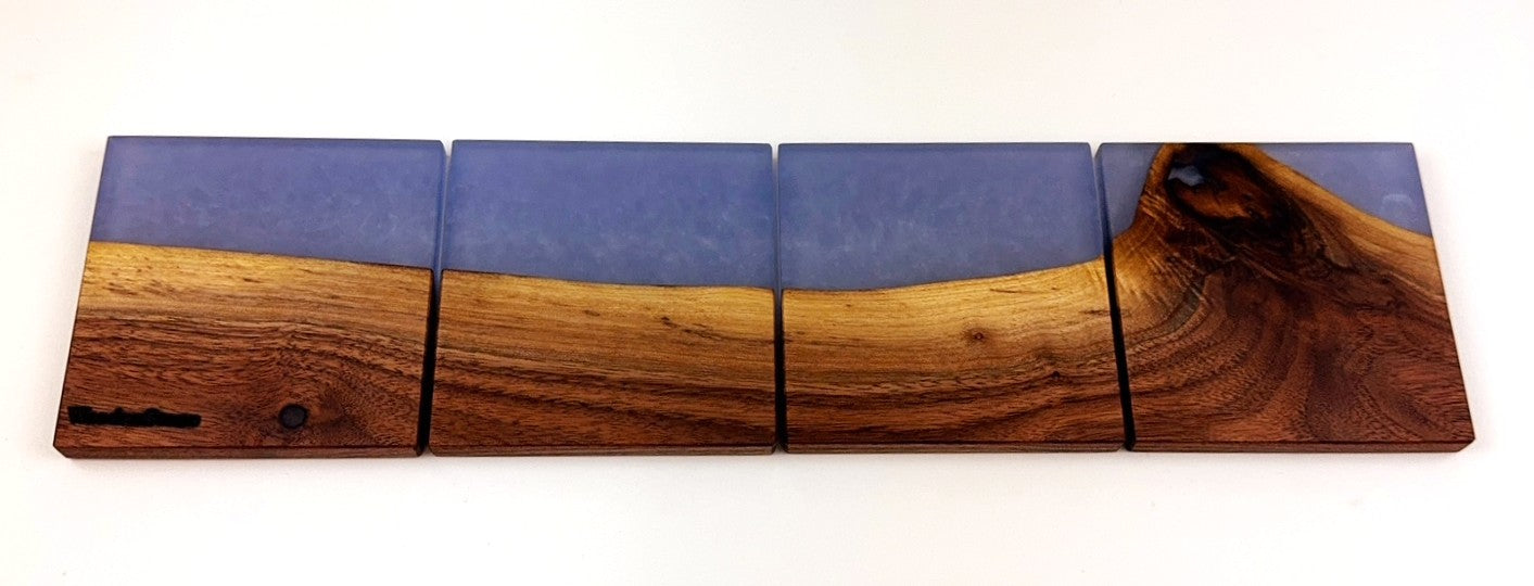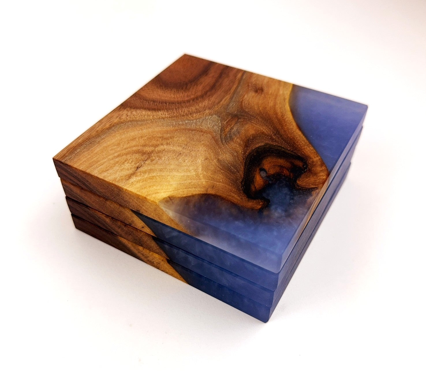 Set of four Walnut coasters with Blueslate epoxy resin. All coasters are identical in size.