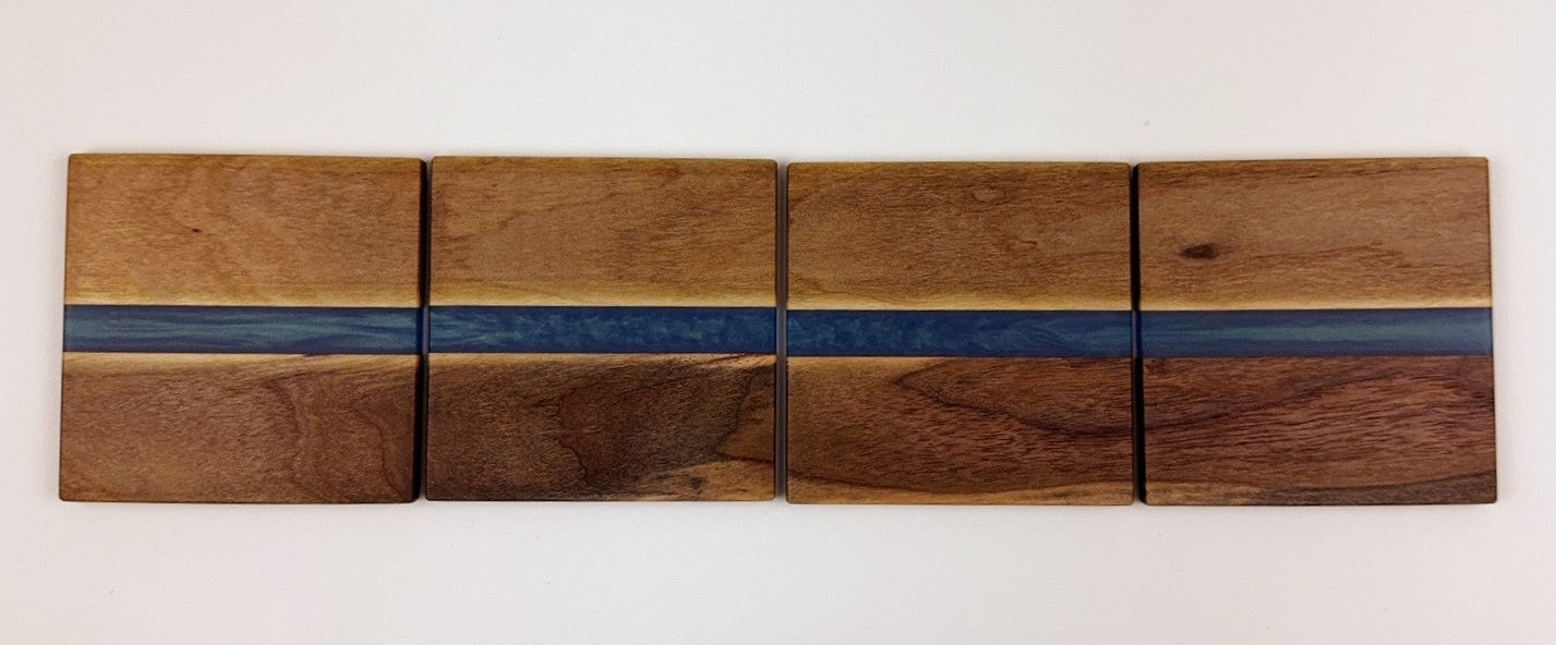 Set of four Walnut coasters with Macaw Blue-Green epoxy resin river. All coasters are identical in size.