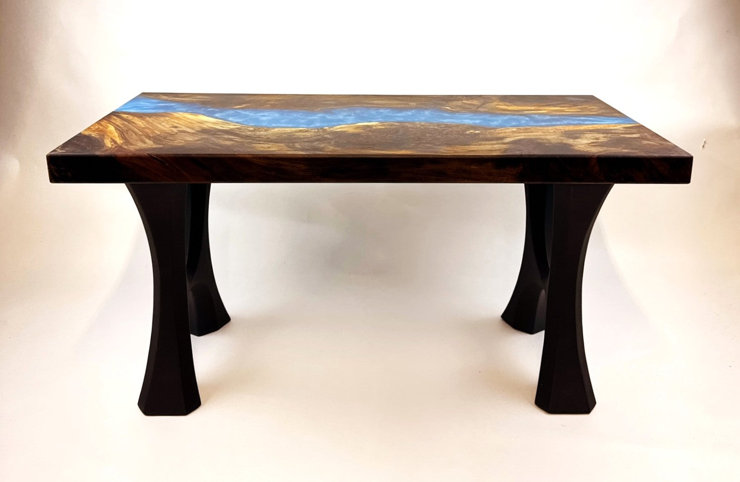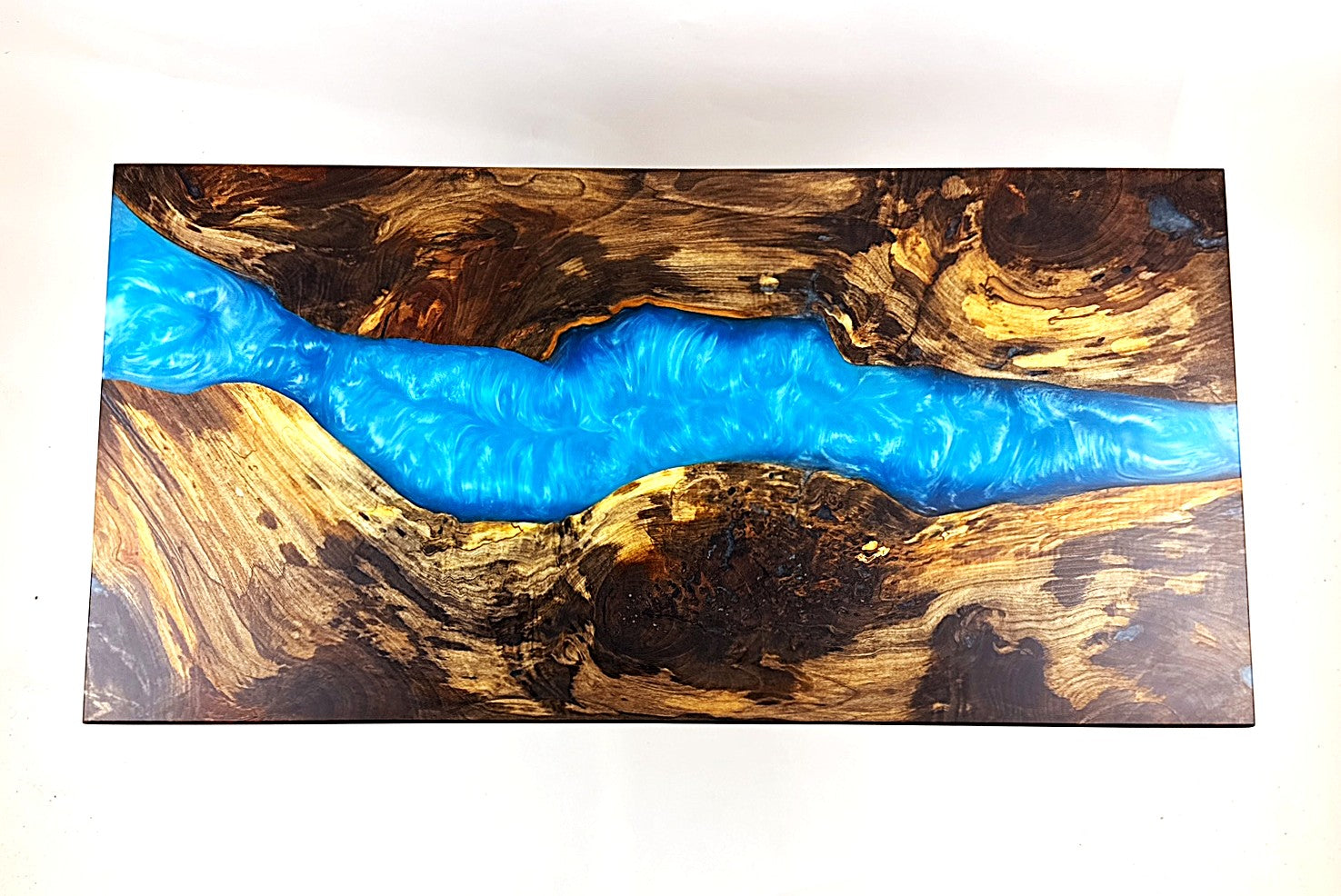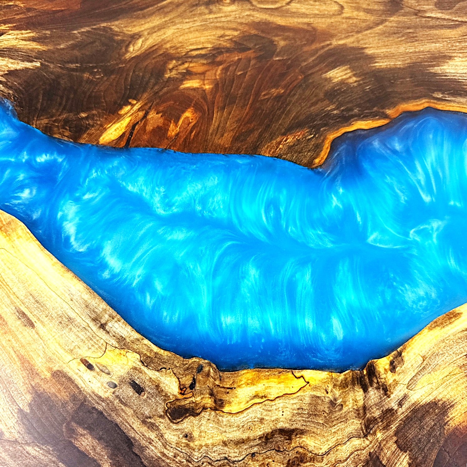 This striking coffee table merges natural artistry with contemporary design. Spalted applewood showcases rich grain patterns and organic character, while a vibrant Caribbean blue epoxy resin river flows through the center, creating a mesmerizing focal point. Heavy-duty black metal legs provide sturdy support and modern contrast to the warm wood tones. At 36" wide by 18" deep and 18" high, it's perfectly proportioned for living rooms and entryways. A conversation piece that elevates any space with handcrafted sophistication and timeless appeal.
