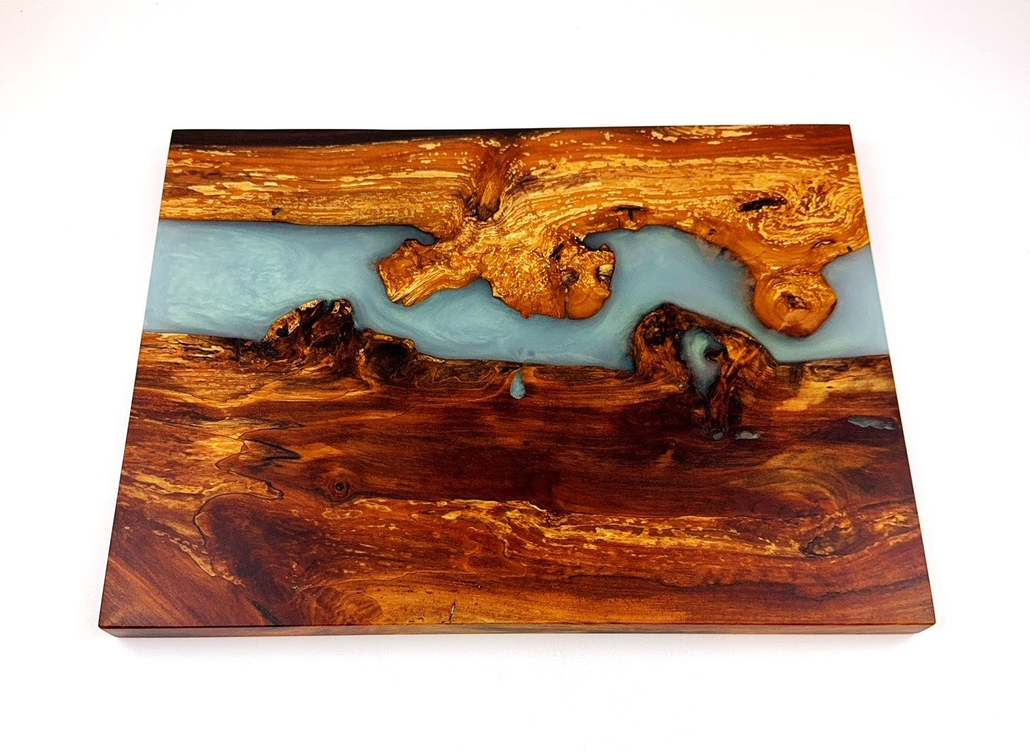 Applewood charcuterie board with Gage-Blue epoxy resin river. Finish is 100% food grade/safe Walrus brand mineral oil with Walrus brand cutting board wax topcoat. Pics show both sides.
