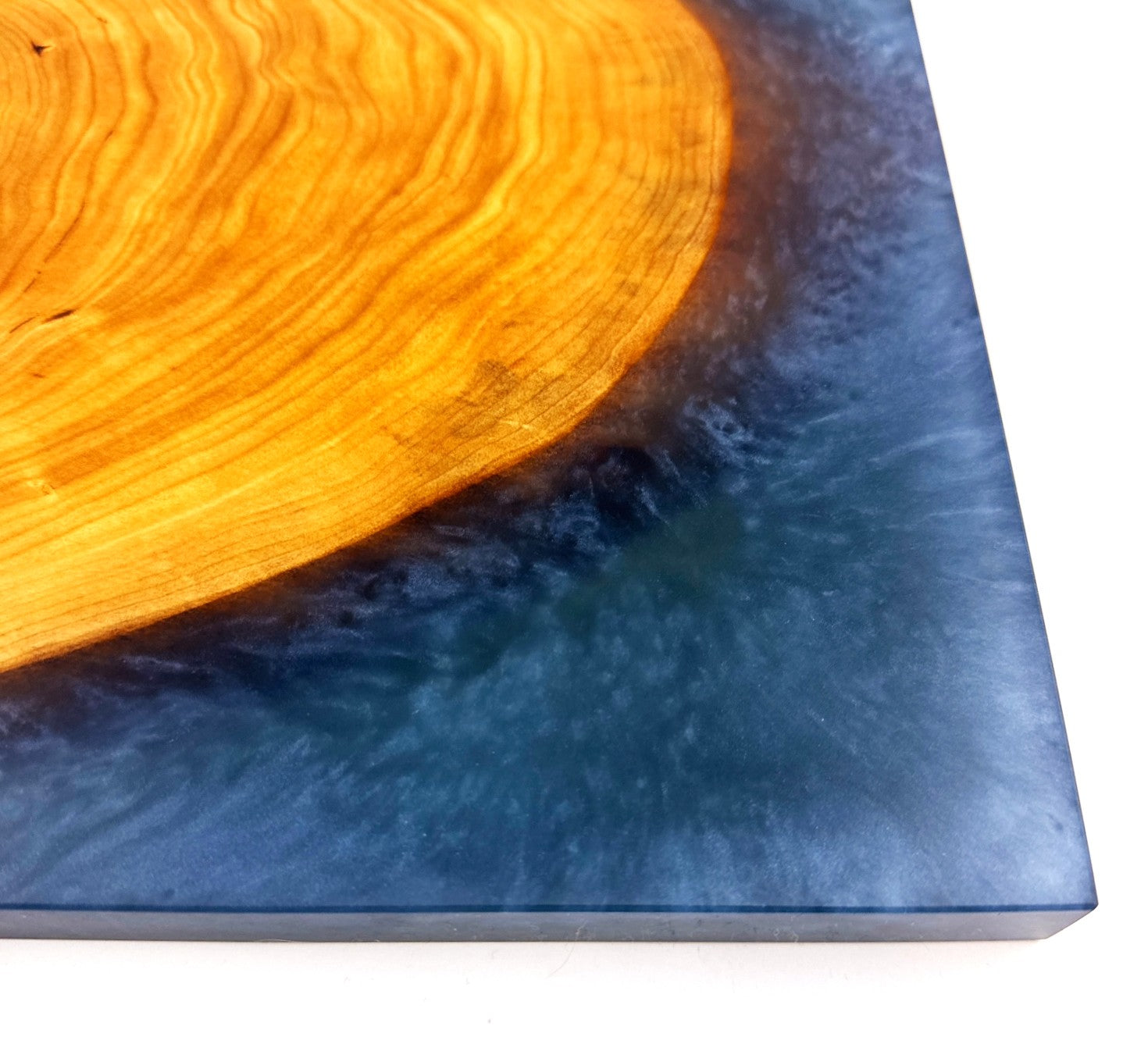 Handcrafted cherry charcuterie board featuring Midnight Slate epoxy resin that creates a sophisticated contrast against warm wood tones. Food-safe mineral oil finish with food-grade cutting board wax topcoat ensures both protection and safety for direct food contact. The reversible design maximizes versatility for entertaining or everyday use.
