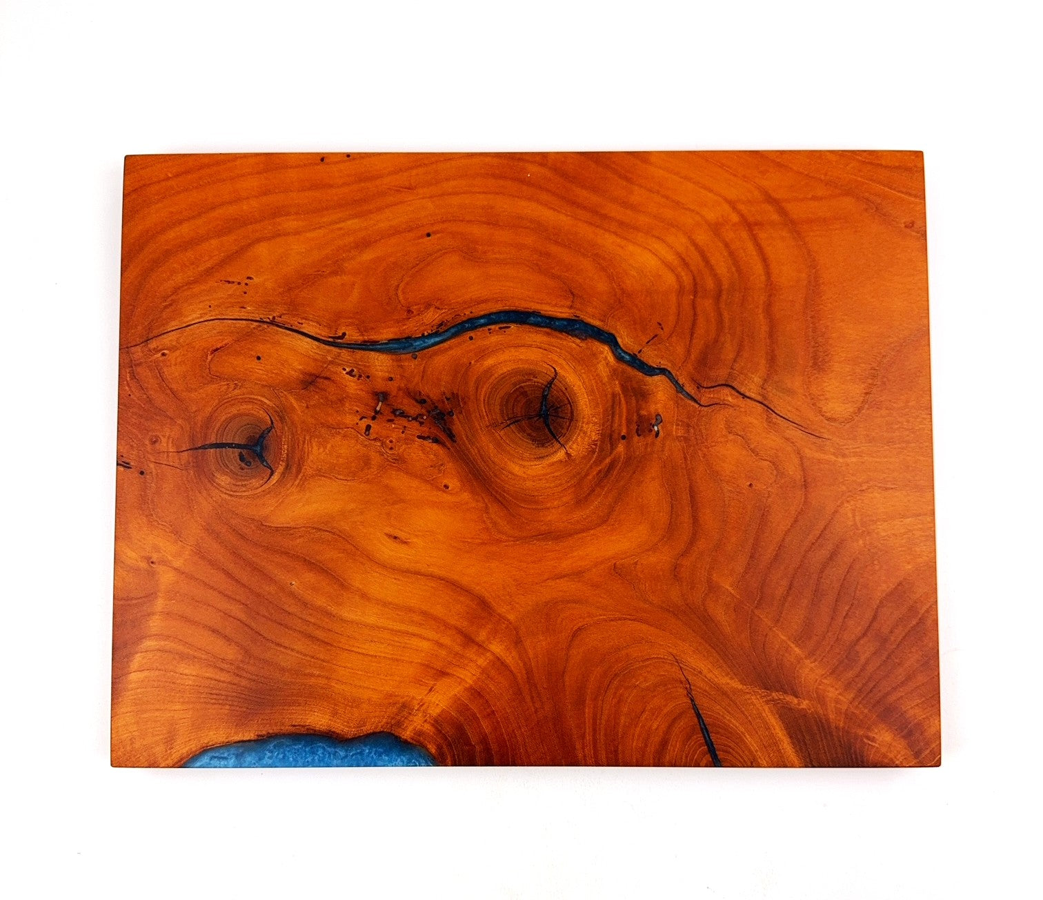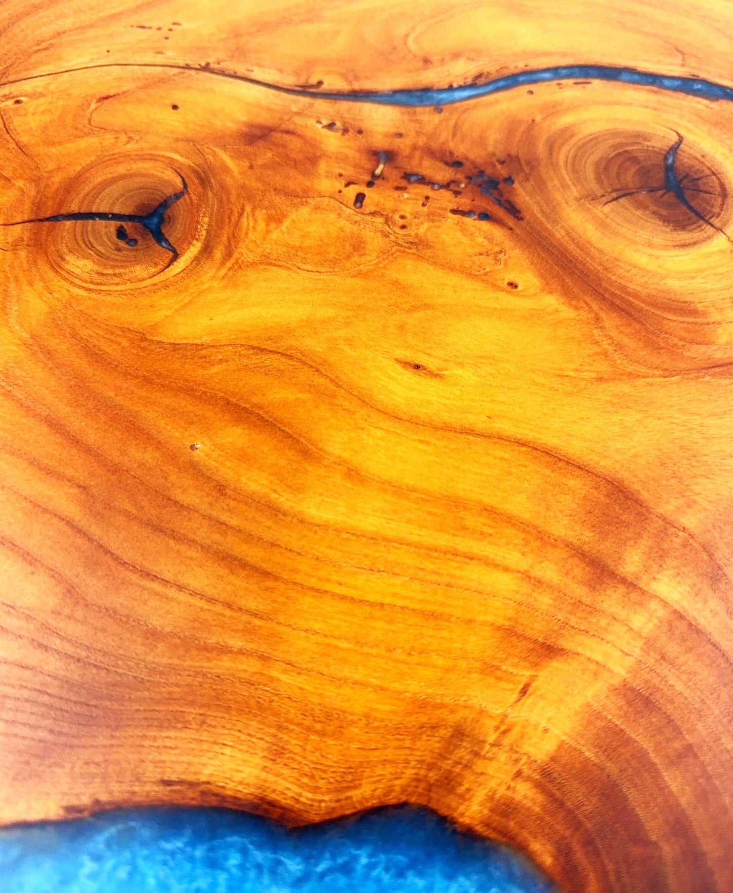 Cherry cutting board with Caribbean Blue epoxy resin. Finish is 100% food grade/safe Walrus brand mineral oil with Walrus brand cutting board wax topcoat., Pics show both sides.