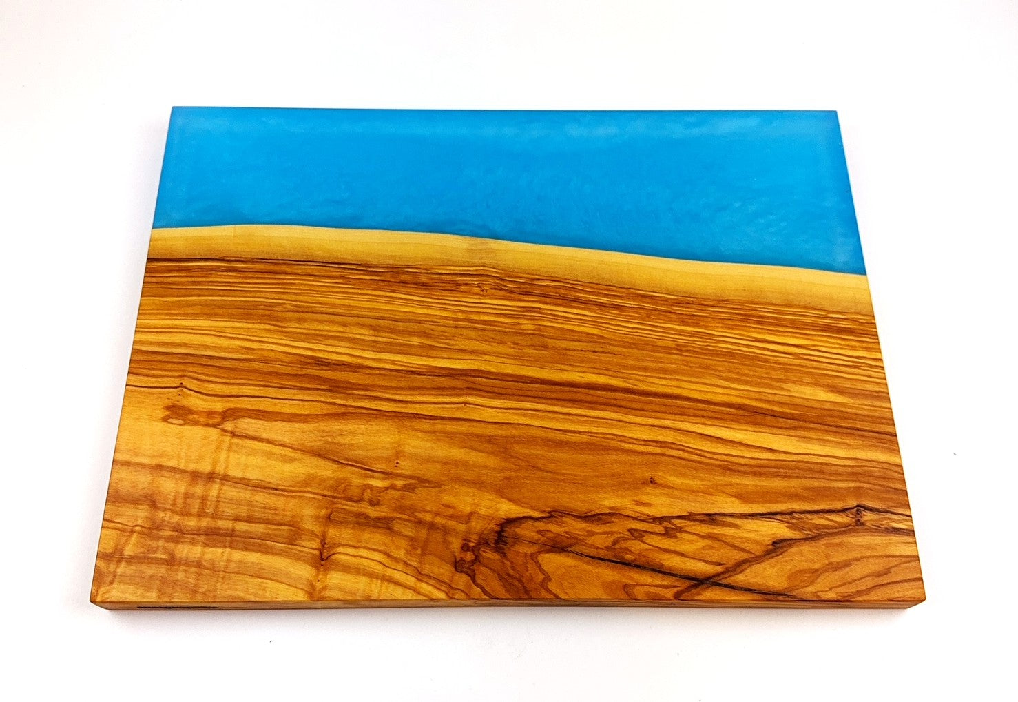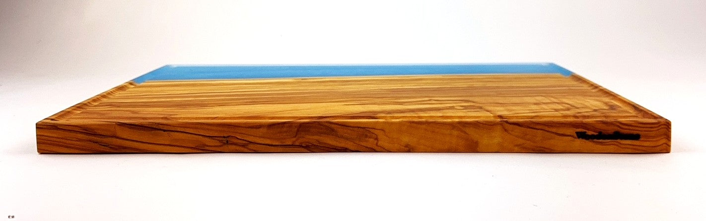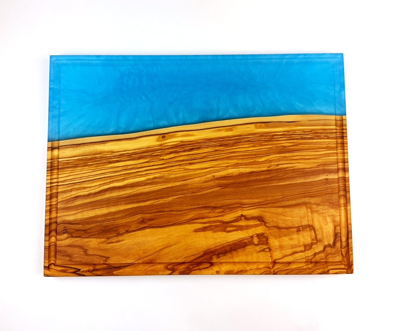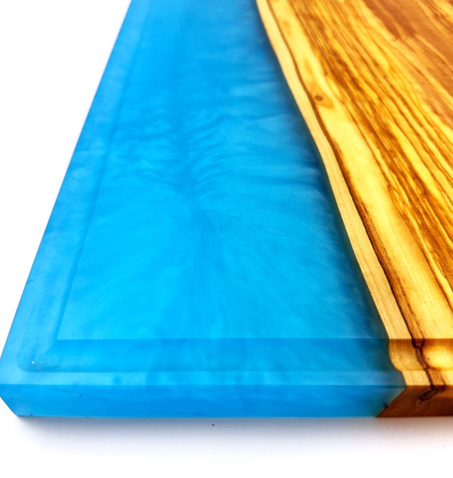 Olivewood cutting board with Caribbean Blue epoxy resin and juice groove. Finish is 100% food grade/safe Walrus brand mineral oil with Walrus brand cutting board wax topcoat. Pics show both sides.