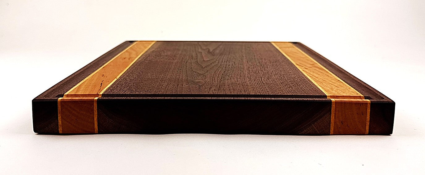 This handcrafted cutting board combines three premium hardwoods—walnut, cherry, and maple—in a striking grain pattern that's as functional as it is beautiful. It provides ample workspace for meal prep, while the integrated juice groove contains liquids and protects your countertop. Finished with food-grade mineral oil and cutting board wax, it's safe for all foods and easy to maintain. A versatile kitchen essential that brings natural elegance to any culinary space.