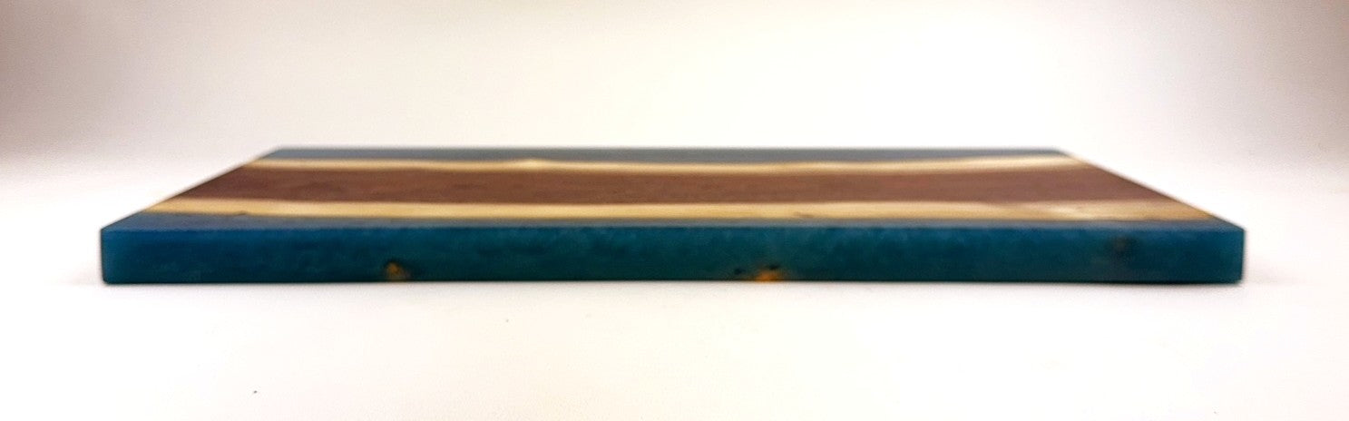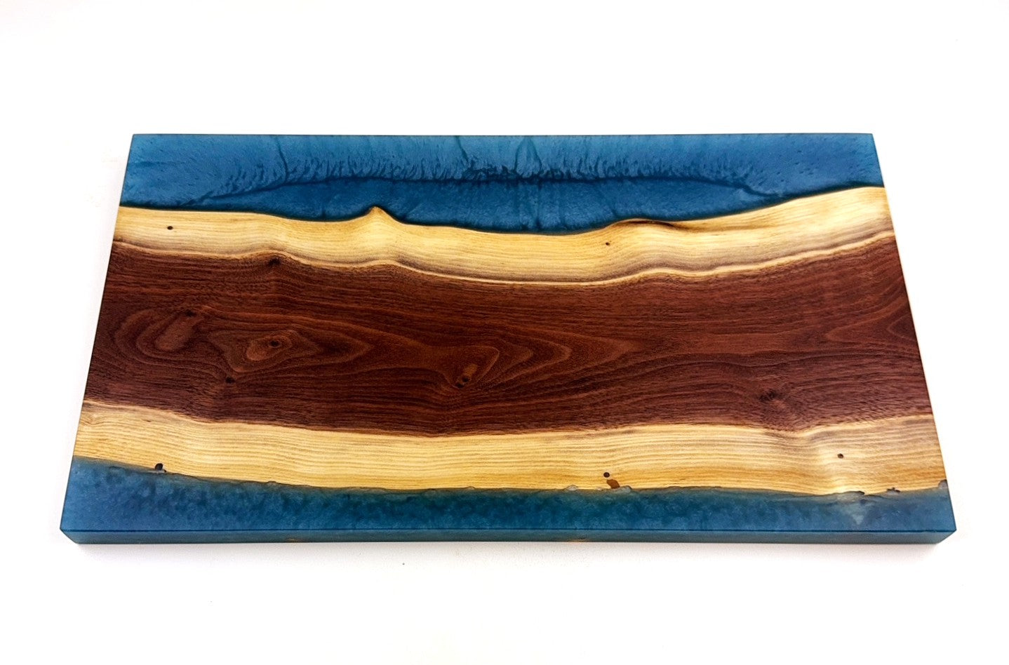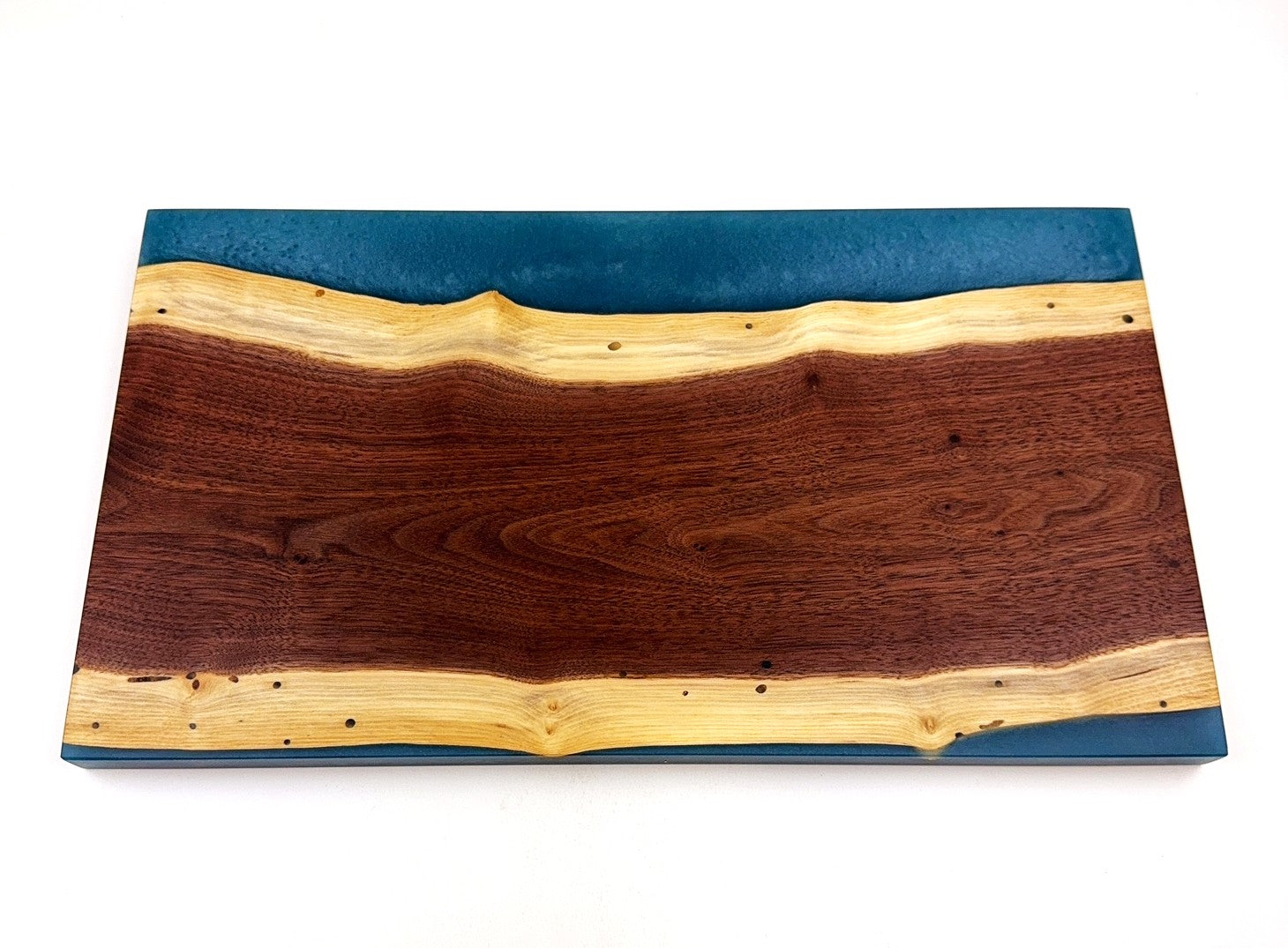 Walnut charcuterie board with Caribbean Gage epoxy resin. Finish is 100% food grade/safe Walrus brand mineral oil with Walrus brand cutting board wax topcoat., Pics show both sides.