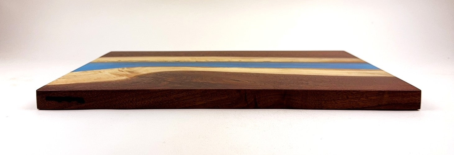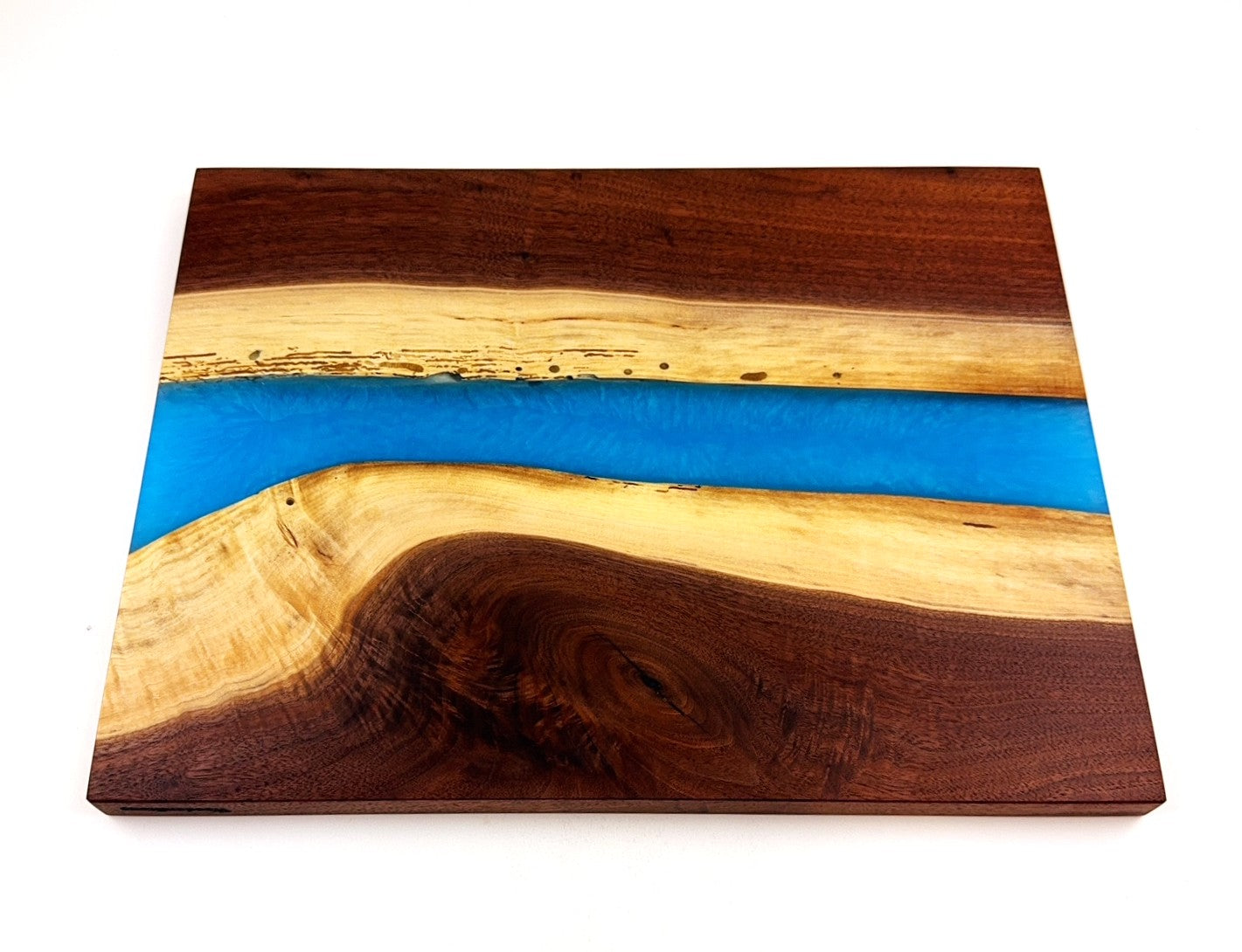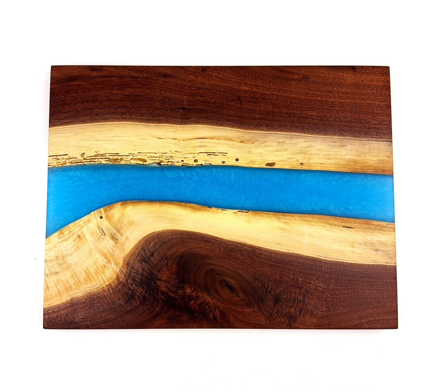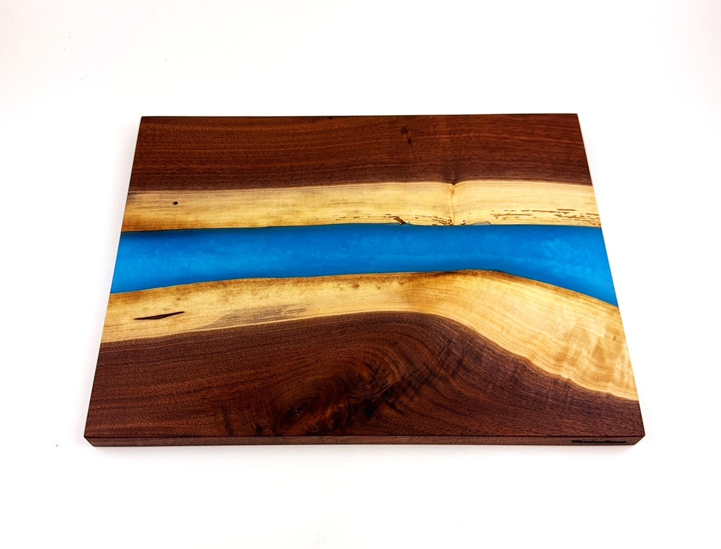 Walnut cutting board with Caribbean Blue epoxy resin river. Finish is 100% food grade/safe Walrus brand mineral oil with Walrus brand cutting board wax topcoat., Pics show both sides.