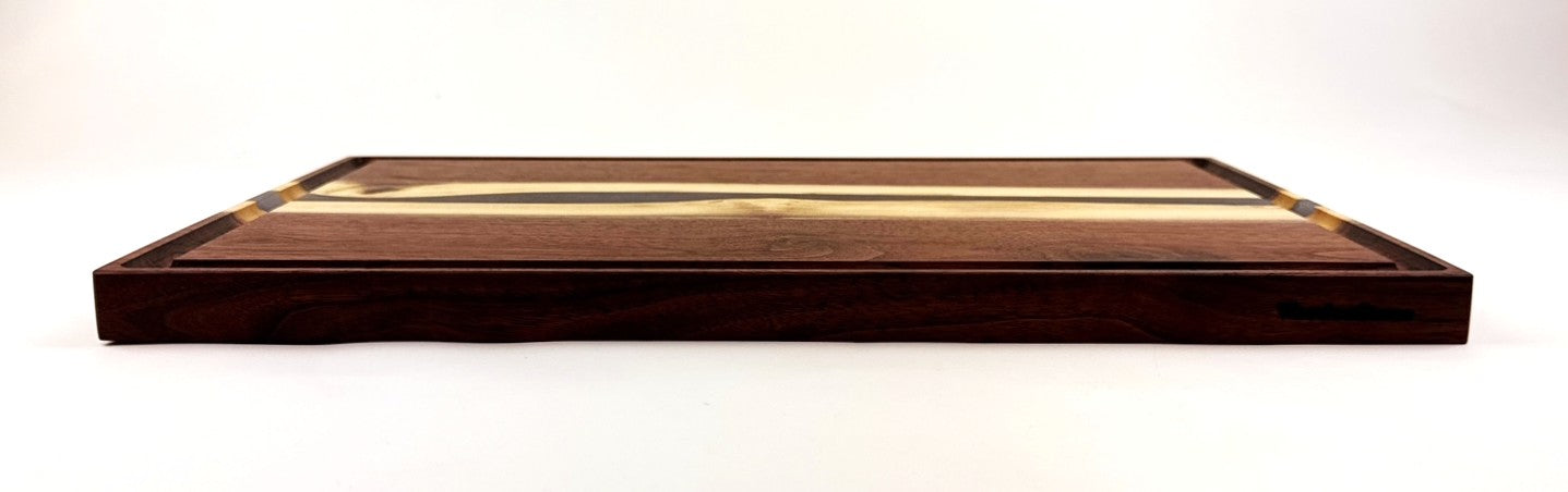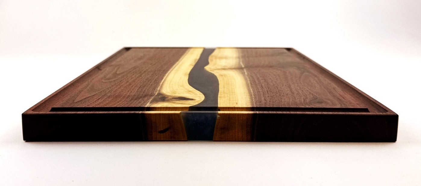 Handcrafted walnut cutting board featuring a Midnight Blue epoxy resin river that flows across the surface, creating a modern aesthetic with natural wood grain. A practical juice groove runs along the perimeter to contain liquids during food preparation. Finished with food-grade mineral oil and cutting board wax for durability and safety. This versatile board works equally well for chopping vegetables, serving charcuterie, or displaying as functional kitchen art. Both sides are finished and ready to use.