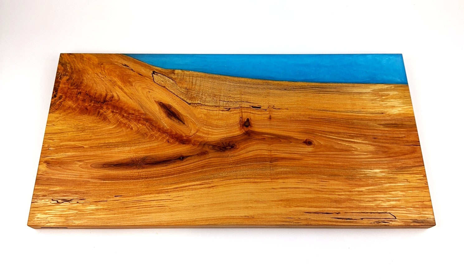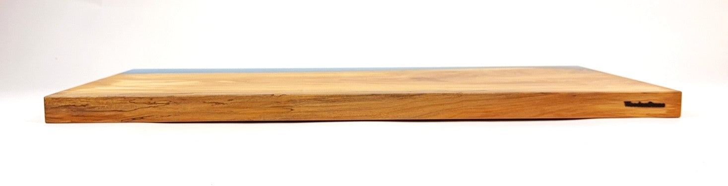 This XL cutting board showcases premium Norway maple paired with striking Caribbean Blue epoxy resin, creating a functional work of art for your kitchen. It offers generous prep space for any culinary task. The food-safe finish combines all-natural mineral oil with a cutting board wax topcoat, providing superior protection and durability while maintaining the wood's natural beauty. Both sides are finished and ready to use, giving you versatility in presentation and longevity. An investment piece that elevates both your cooking experience and kitchen aesthetics.