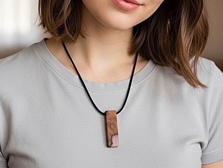 Applewood necklace with Rose Gold epoxy resin. 18" adjustable leather cord.