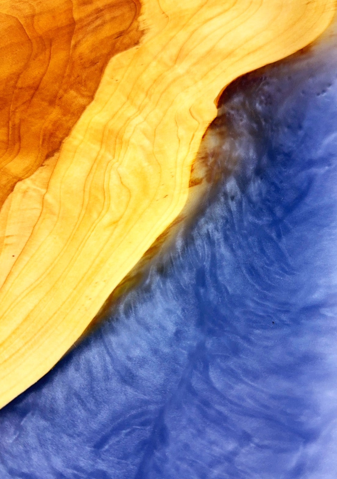 XL Applewood serving tray with Blueslate epoxy resin and stainless-steel handles. Finish is 100% food grade/safe Walrus brand mineral oil with Walrus brand cutting board wax topcoat.