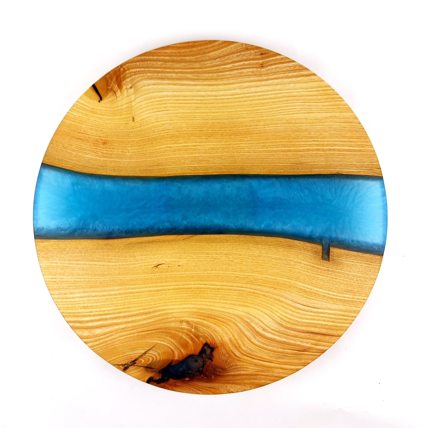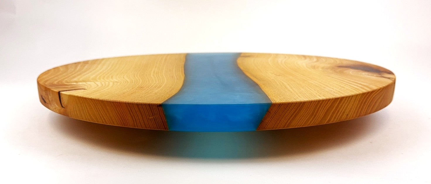 Chestnut lazy Susan with Caribbean Blue epoxy resin river. Finish is 100% food grade/safe Walrus brand mineral oil with Walrus brand cutting board wax topcoat so food can be placed directly on it if desired. Smooth spinning mechanism for easy turning.