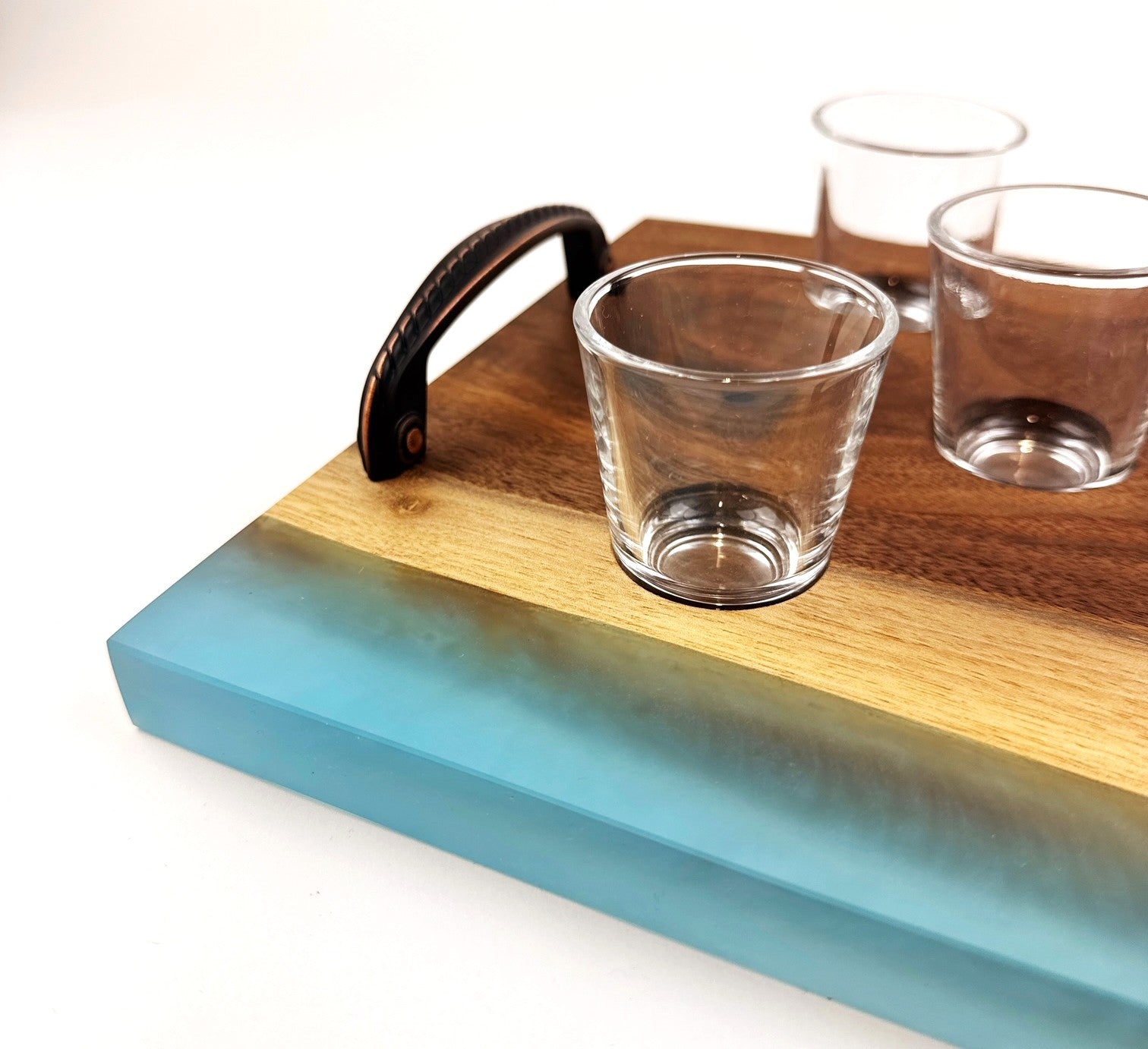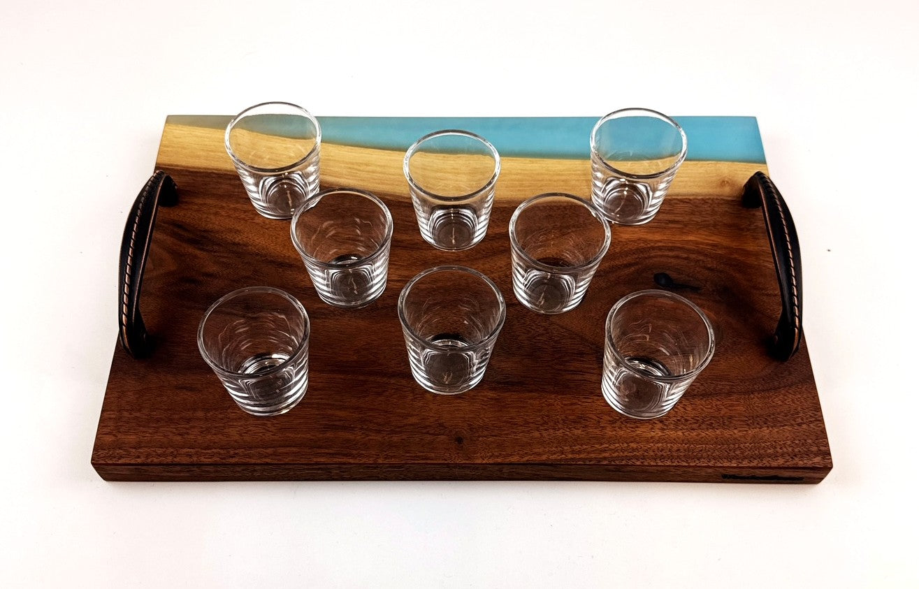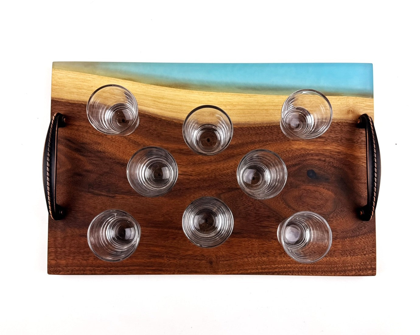Elevate your entertaining with this handcrafted walnut serving tray, featuring Caribbean Blue epoxy resin that creates a sophisticated visual contrast. The recessed design includes strategically placed holes to secure shot glasses, preventing spills and keeping your presentation polished. Oil-rubbed bronze handles provide both functional grip and refined aesthetics. This tray arrives complete with eight matching shot glasses, making it ready for immediate use. A statement piece that combines artisanal craftsmanship with practical design for the discerning host.