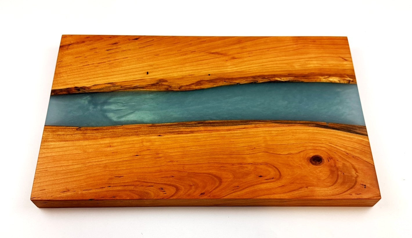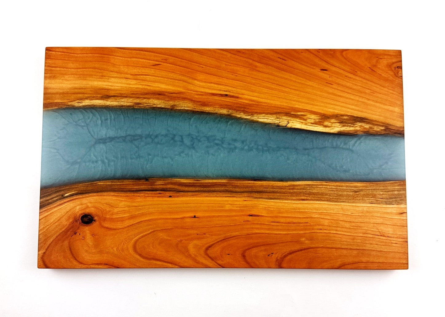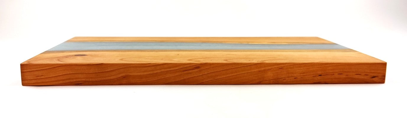 Transform your kitchen workspace with this exquisite Cherry Epoxy Resin River Cutting Board. Handcrafted from premium cherry wood, it showcases a Gage-Slate epoxy river that winds through the grain, making it a unique work of art. It offers ample surface for chopping, slicing, and serving. The food-safe finish combines 100% mineral oil with a protective cutting board wax topcoat, ensuring durability and safety for your family's meals. With reversible sides, you get two beautiful designs in one versatile piece. Perfect for home chefs who refuse to compromise on style or quality.