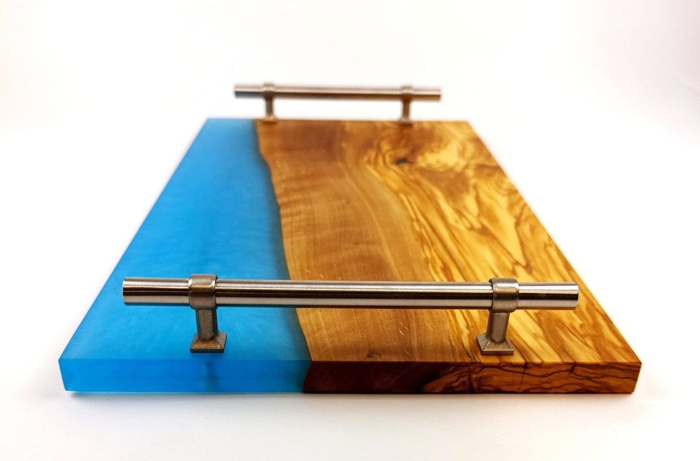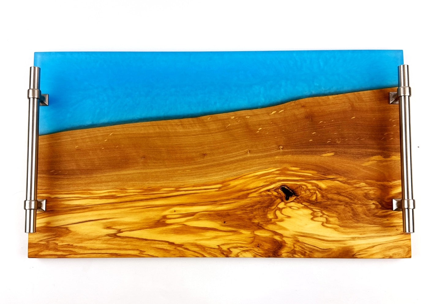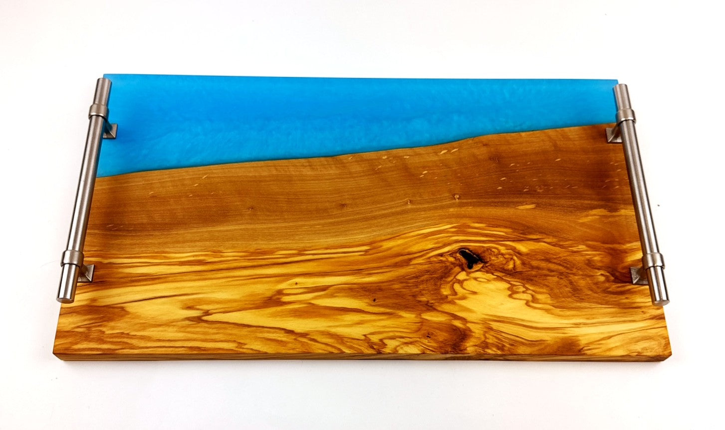 Handcrafted from premium olivewood, this elegant serving tray features Caribbean Blue epoxy resin that creates a sophisticated visual contrast. Sturdy stainless-steel handles ensure comfortable transport, while the food-safe mineral oil finish with cutting board wax topcoat protects the wood and maintains its natural beauty. It's perfectly proportioned for entertaining or everyday use. An exceptional piece that combines artisanal craftsmanship with practical functionality.