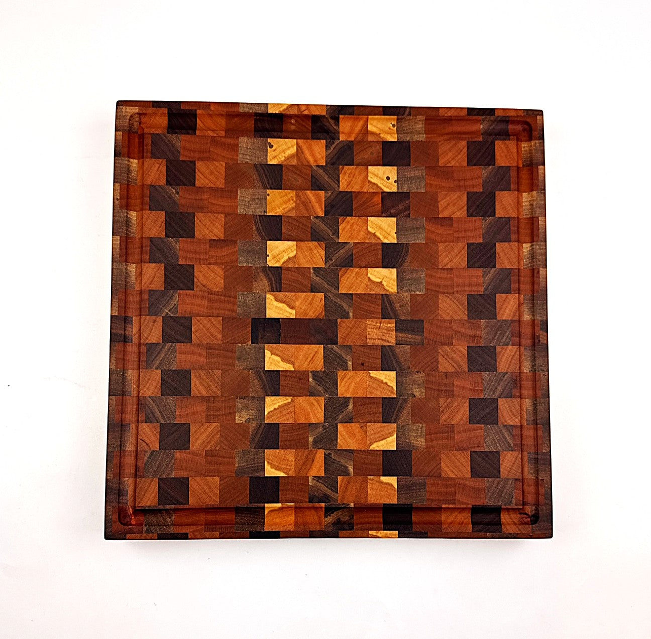 Handcrafted end grain cutting board featuring a striking blend of Roasted Walnut, Walnut, and Cherry wood. The 11½" square design includes a practical juice groove to contain liquids while cutting. Finished with food-grade mineral oil and cutting board wax, this board is safe for all your culinary needs. Rubber feet on the base protect your countertops and keep the board stable during use. A durable, beautiful addition to any kitchen.