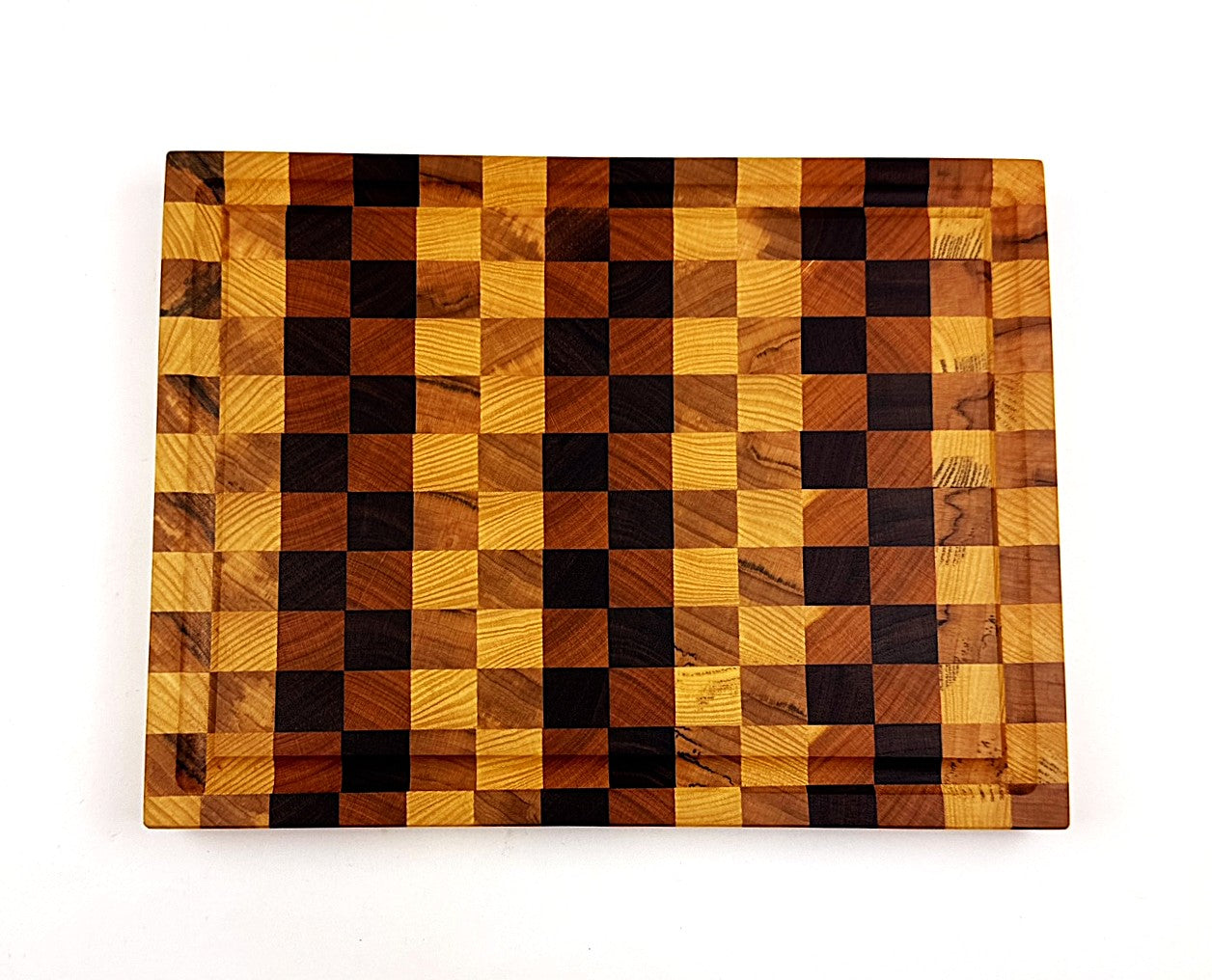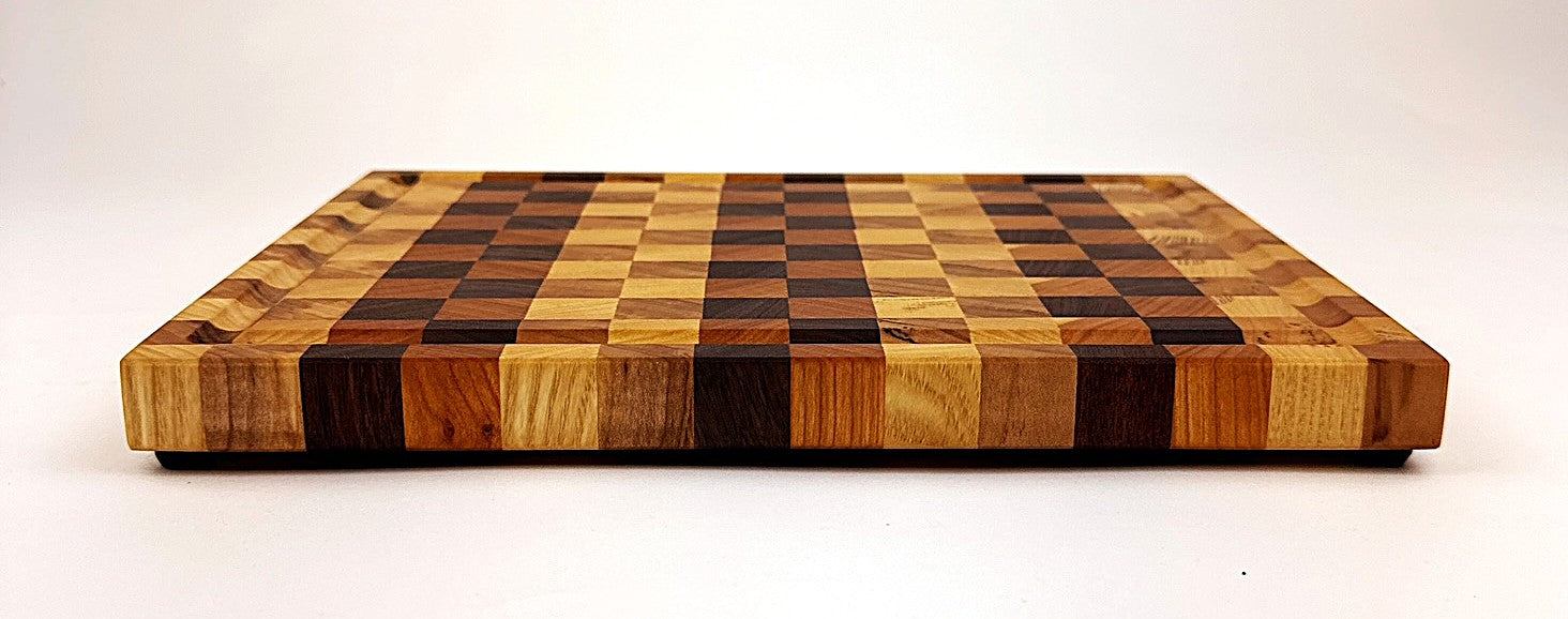 This handcrafted end grain cutting board combines four premium hardwoods—walnut, cherry, maple, and ash—creating a checkered pattern that's as functional as it is beautiful. The end grain construction provides superior durability and self-healing properties, while the integrated juice groove catches liquids. Finished with food-safe mineral oil and protective wax, it's ready to use right out of the box. Rubber feet protect your countertops and keep the board stable during use. Perfect for meal prep, serving, or display. Measures 10½" W x 8" D x ¾" H.