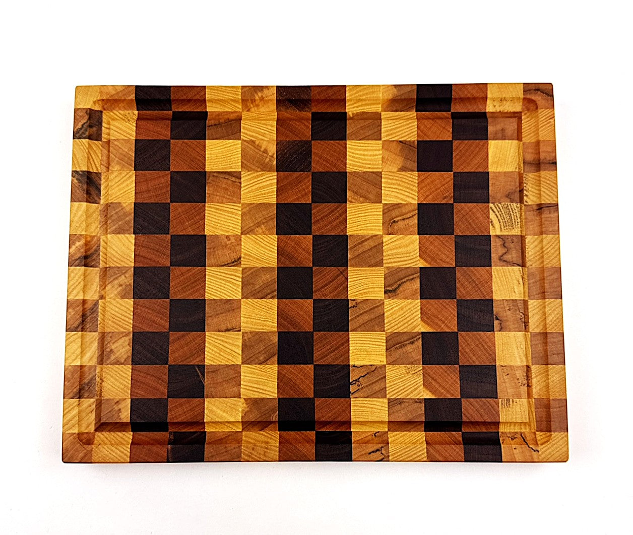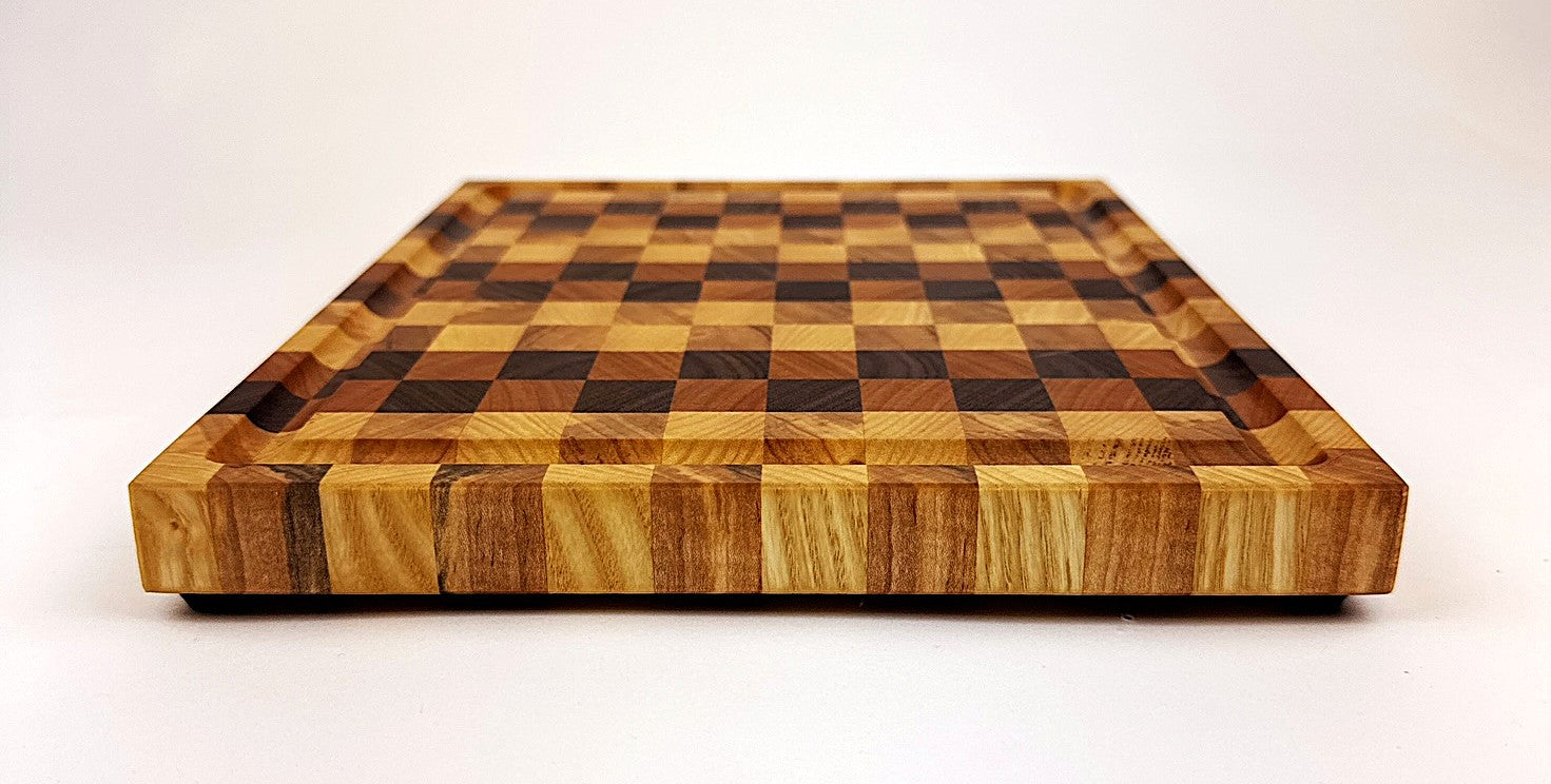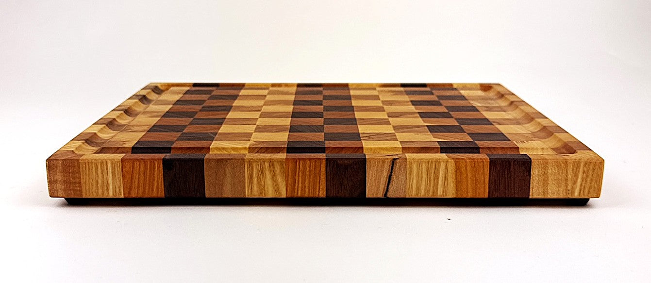 This handcrafted end grain cutting board combines four premium hardwoods—walnut, cherry, maple, and ash—creating a checkered pattern that's as functional as it is beautiful. The end grain construction provides superior durability and self-healing properties, making it ideal for daily kitchen use. A practical juice groove catches liquids and prevents mess on your countertop. The board is finished with food-safe mineral oil and protective wax, ensuring longevity and easy maintenance. Non-slip rubber feet keep it securely in place while protecting your surfaces. Perfect for food prep, serving, or as a statement piece in any kitchen. Measures 10½" W x 8" D x ¾" H.