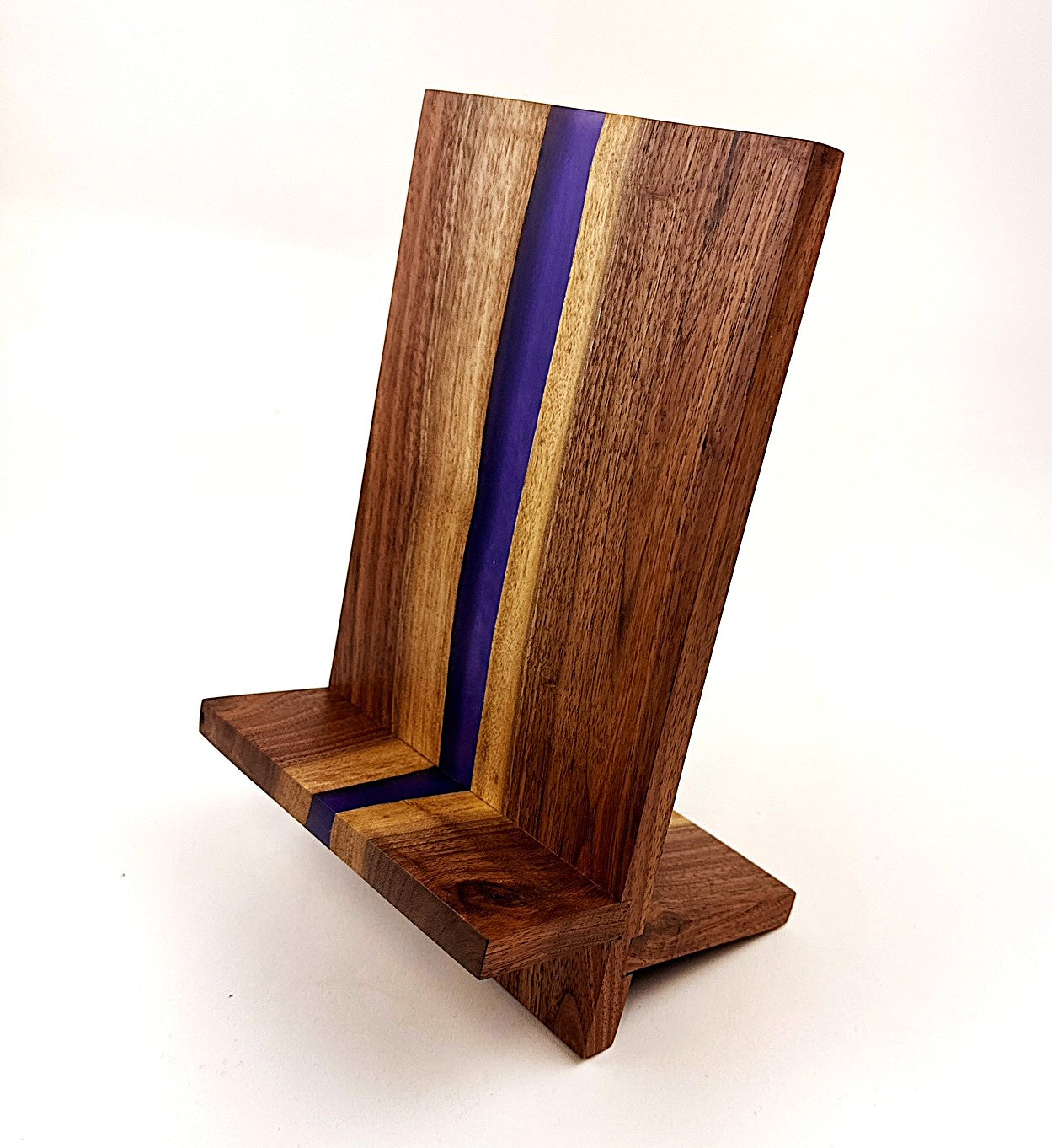 This handcrafted walnut stand features a violet epoxy resin river that creates a distinctive visual centerpiece for any desk. Measuring 10" tall by 6" wide by 5" deep, it accommodates phones and tablets at an optimal viewing angle while the natural wood base provides stability. The combination of premium walnut and vibrant resin work showcases artisanal craftsmanship, making it both functional and decorative.