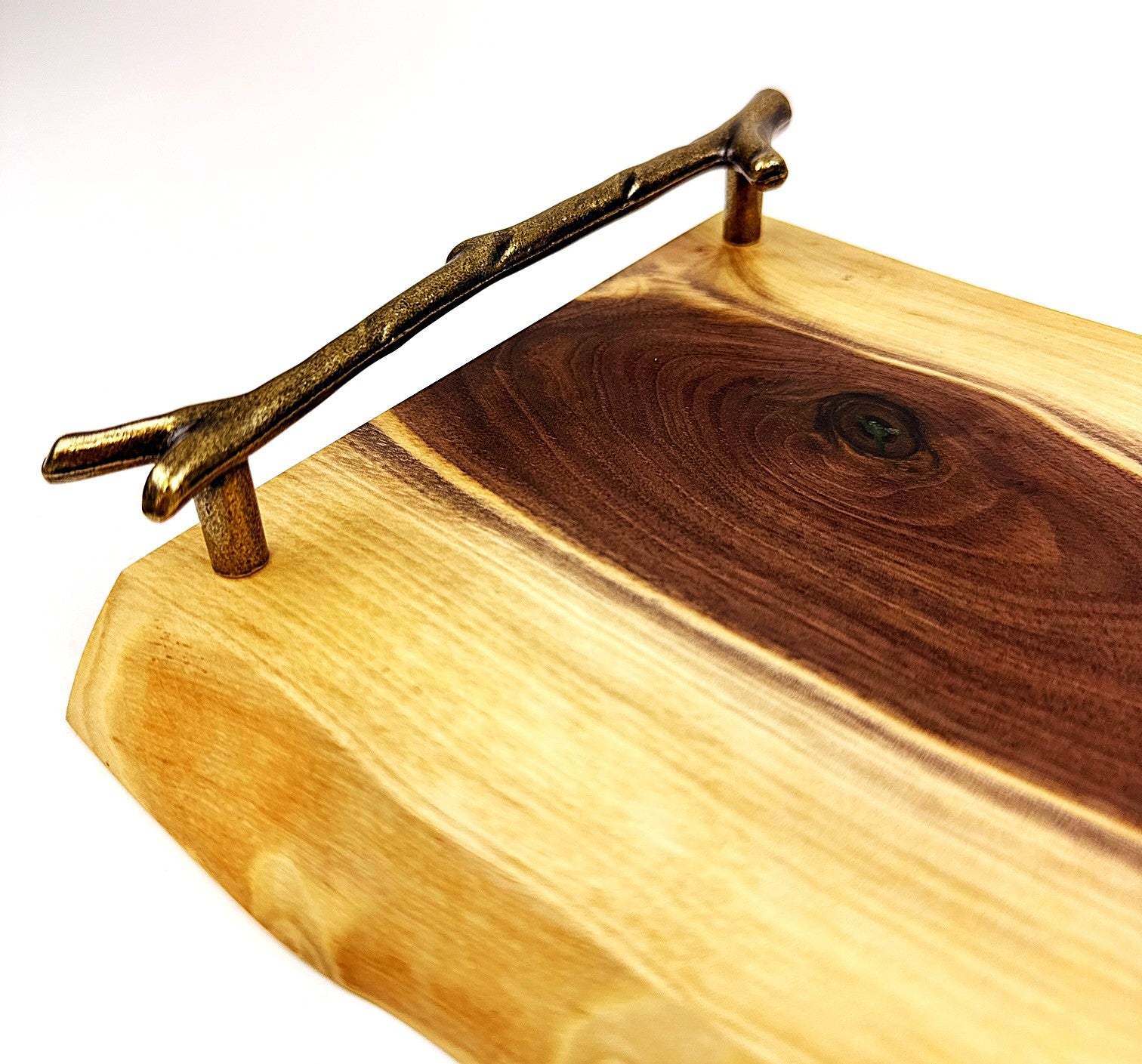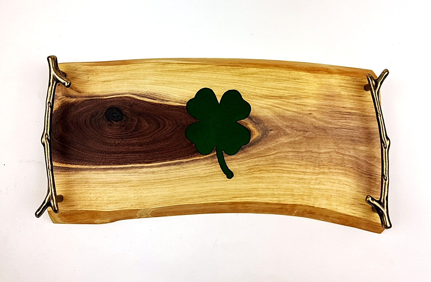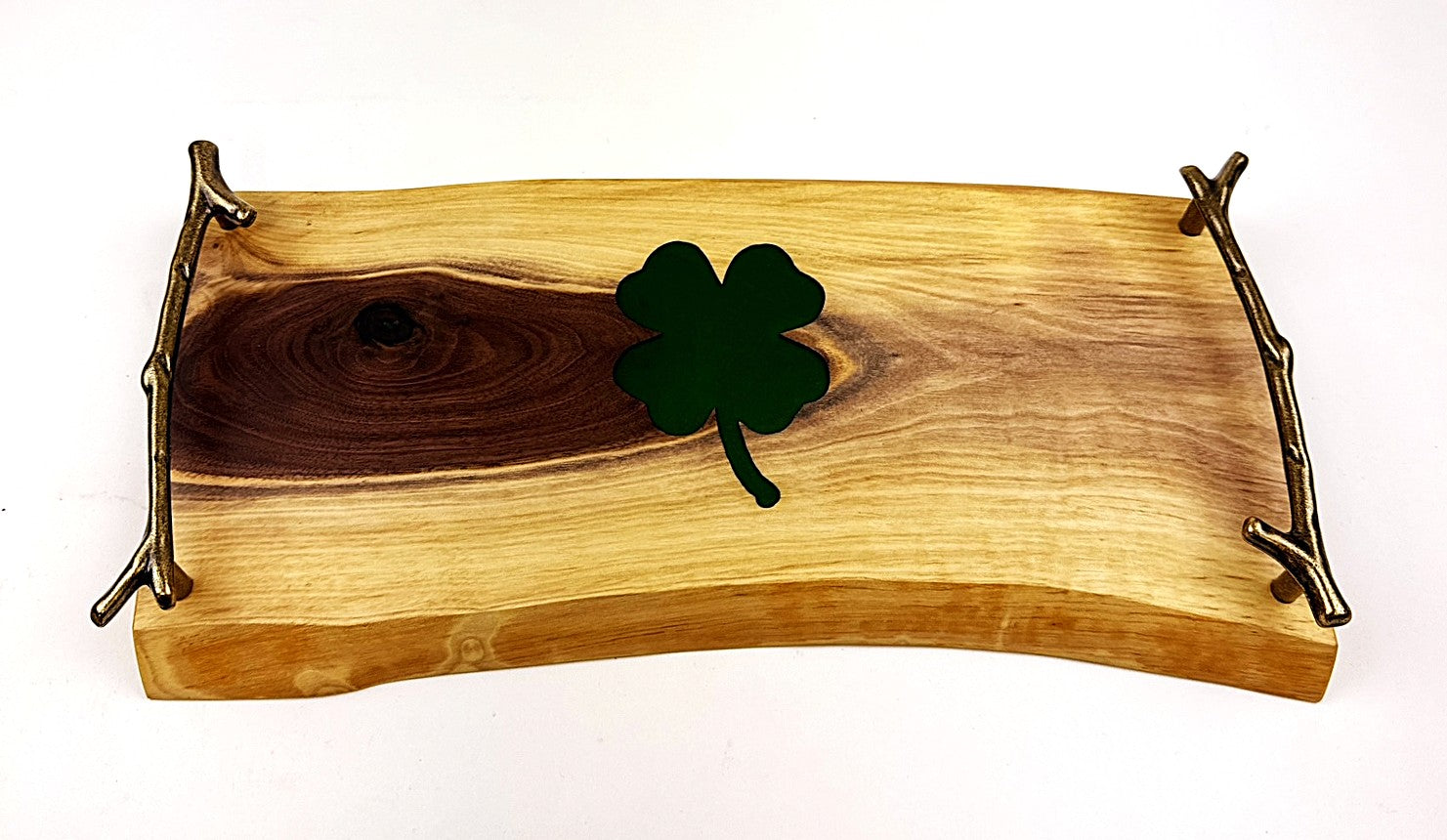 Handcrafted walnut serving tray featuring a Bonsai-Green epoxy resin 4-leaf clover inlay, complemented by elegant bronze branch handles. The food-safe finish combines mineral oil with cutting board wax topcoat, making it perfect for serving or display. Measures 14" W x 7½" D x 1¾" H. A unique blend of natural wood and artistic resin work that brings warmth and character to any table.