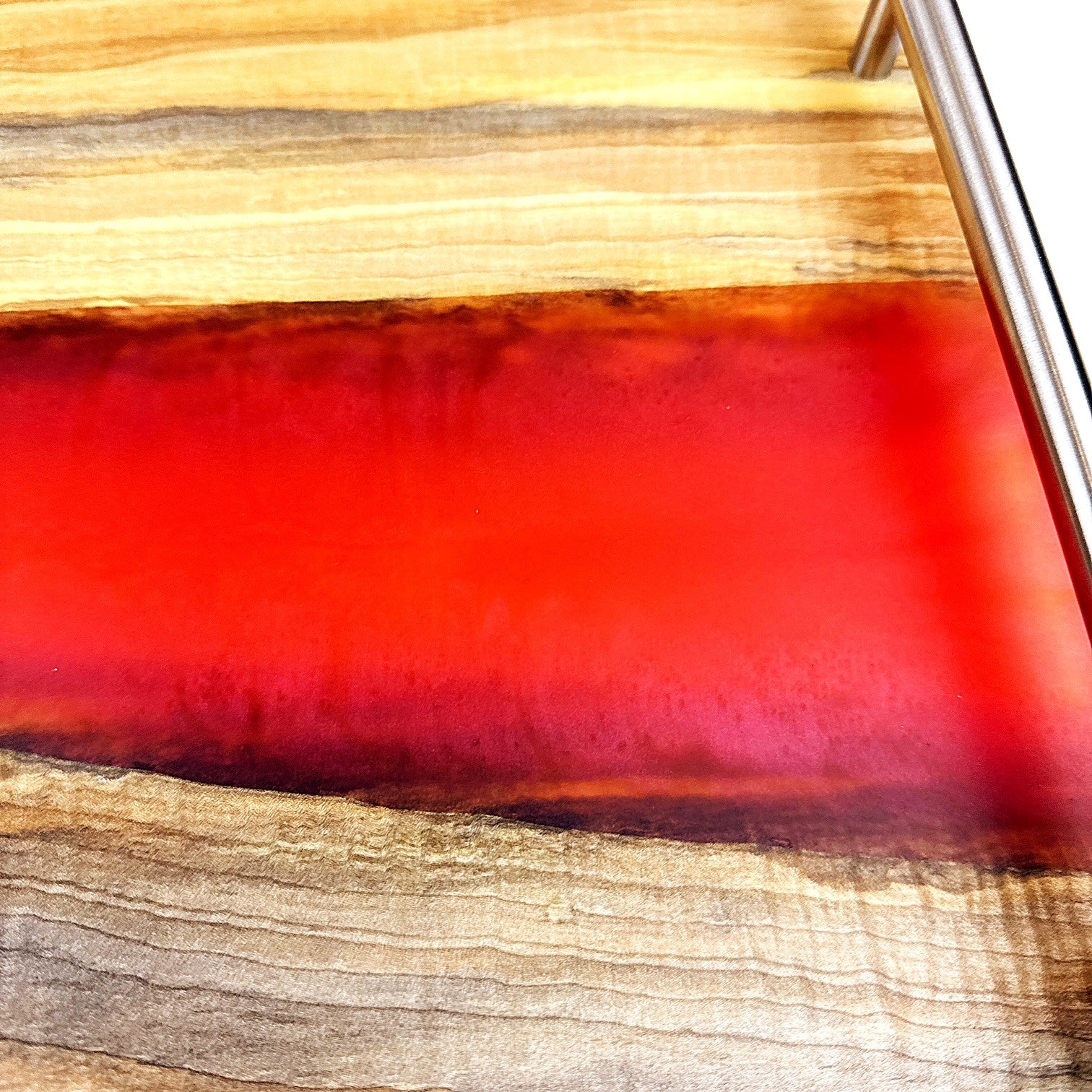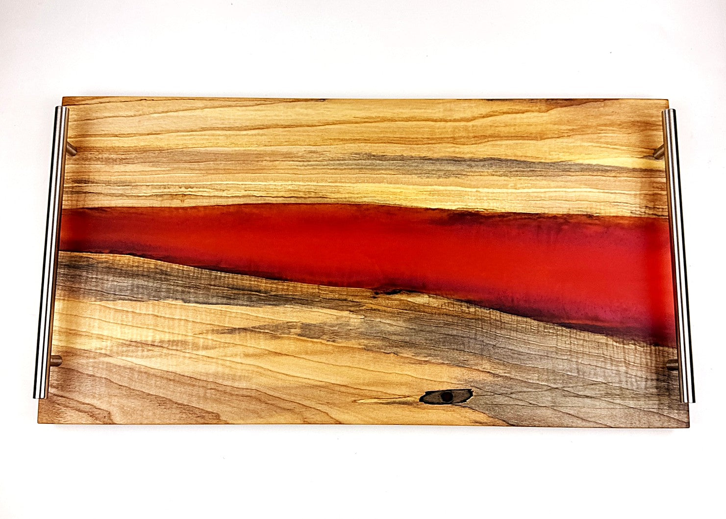 Handcrafted from premium Norway maple, this extra-large serving tray showcases a striking Baku Red epoxy resin river that adds contemporary elegance to any table. It offers generous space for entertaining. Stainless-steel handles ensure secure, comfortable carrying, while rubber feet protect your surfaces and prevent shifting. The food-safe mineral oil finish with cutting-board wax topcoat creates a durable, naturally beautiful surface suitable for serving or display. A sophisticated piece that combines artisanal craftsmanship with practical design.
